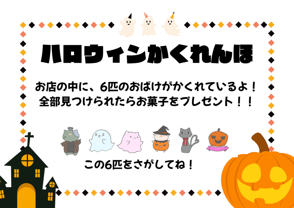 ビンゴ1列ごとに景品をプレゼント!&店内にかくれた6匹のおばけを探してお菓子をゲットしよう!